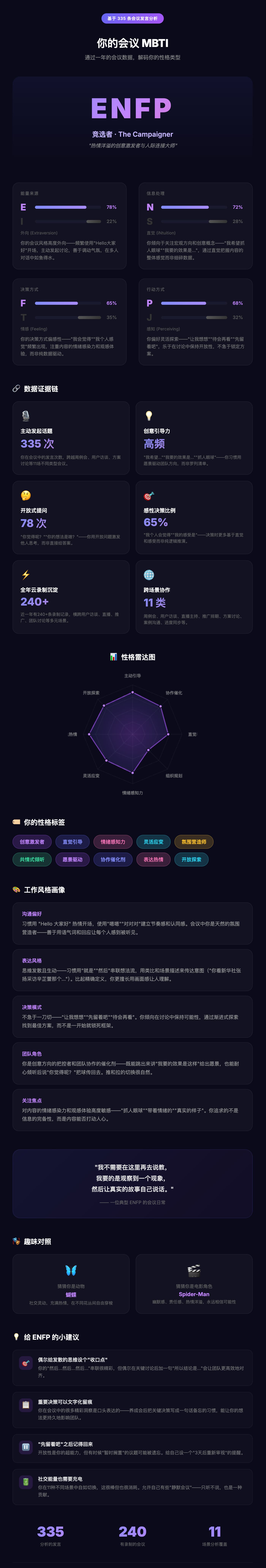 读取我腾讯会议里近一年的会议录制及记录,不只从开会数量和时长,不只读取会议名称,主要从我的发言内容及表达,生成一份有趣的适合分享传播的MBTI报告。以网页形式,Spotify Wrapped 风格。